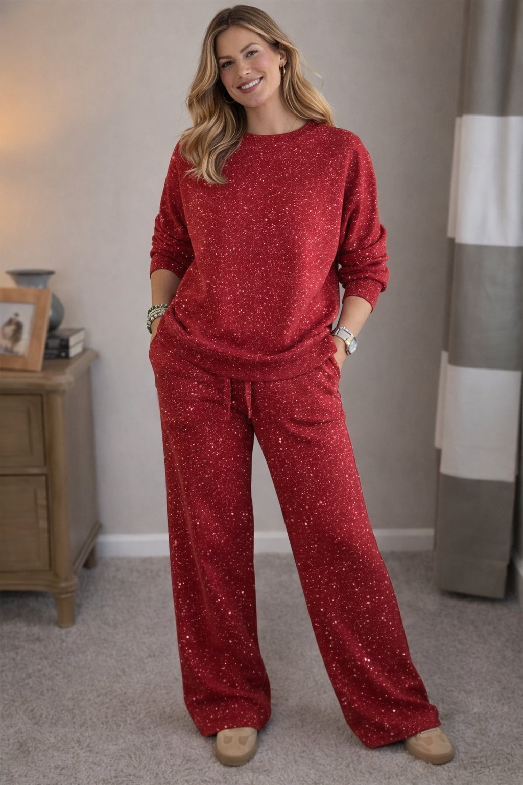El conjunto brillante con cuello redondo de De Noor ofrece un aspecto refinado sin renunciar a la comodidad. Su ajuste flexible y su corte moderno hacen que este elegante conjunto sea ideal tanto para momentos de relax en casa como para salidas informales con un toque de clase.
